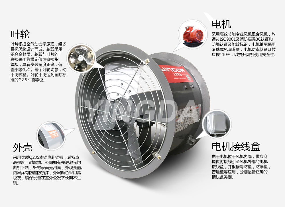 ——防爆(bào)型:電機為隔(gé)爆型、葉片為鋁合金,適用於易(yì)燃、易(yì)爆氣體的(de)環境中(zhōng),防(fáng)爆等級為(wéi)EXdIIBT4。