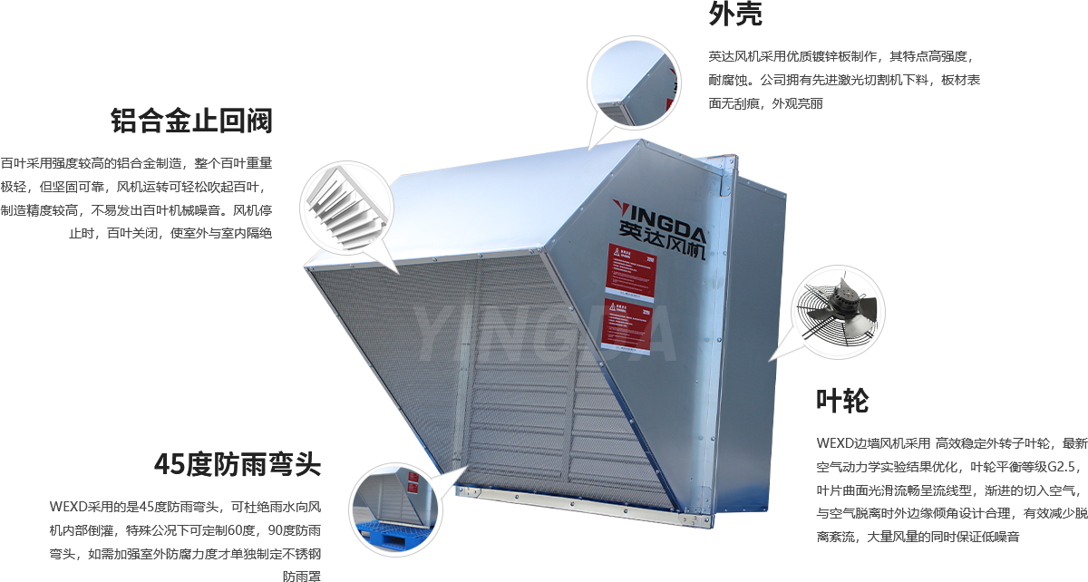 WEXD采用的是45度防雨彎頭,可杜絕雨水向風(fēng)機內部倒灌(guàn),特殊公況下可定製60度,90度防雨彎頭,如需加強(qiáng)室外防腐力度才(cái)單(dān)獨(dú)製定不(bú)鏽(xiù)鋼(gāng)防雨罩。