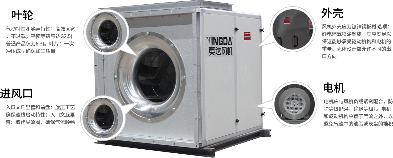 電機應與風機負(fù)載緊密配合,防護等級IP54,絕緣等級F。電機和驅動機構應置於氣流之(zhī)外,以避免氣流中的油脂或灰塵的(de)堆積。